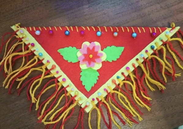 Материал для занятия: русская национальная одежда, платок – шаль, образец; заготовки: шаблоны - треугольники разного цвета - «платки» (с отверстиями для бахромы), шерстяные нитки разного цвета, ножницы, клей ПВА.