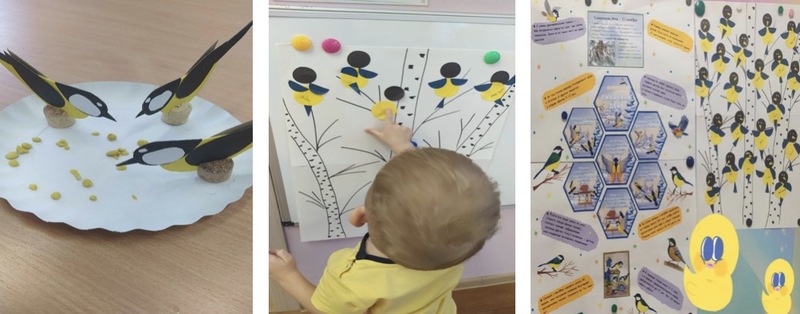 – «Синичка - птичка» – коллективная аппликация, Беседа "Синичкин день", Лепка «Зернышки для птичек», презентация слайдов «Зимующие птицы», Конструирование «Кормушка»