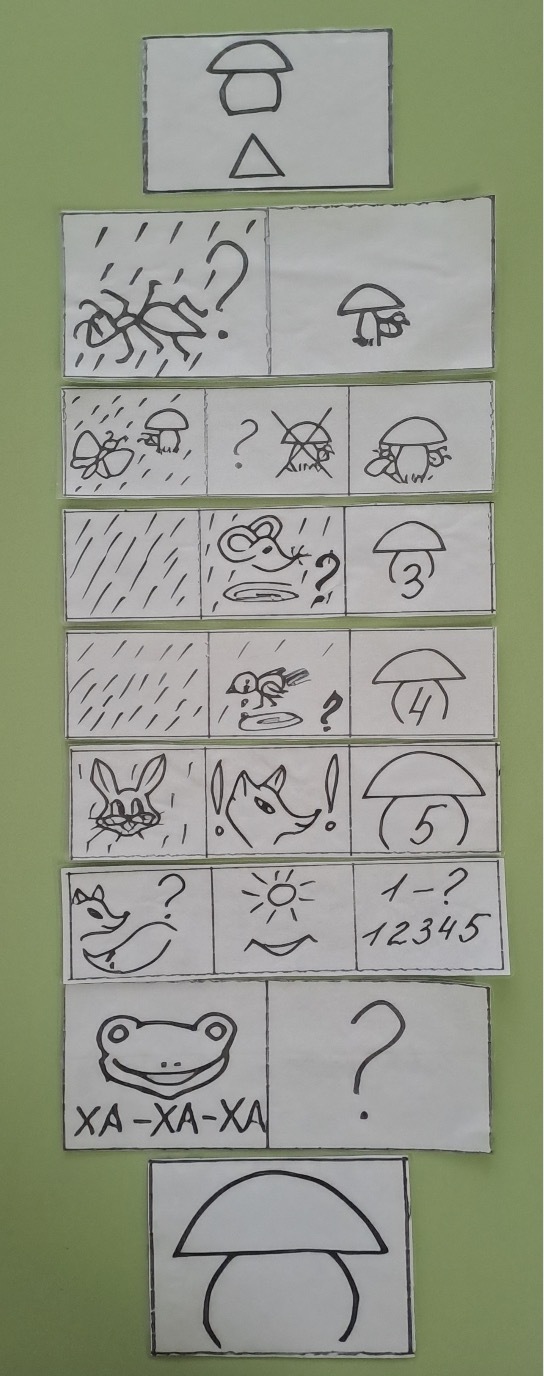 Воспитатель поочередно выставляет на магнитную доску мнемосхемы с обозначением сюжетов сказки, который описывают дети