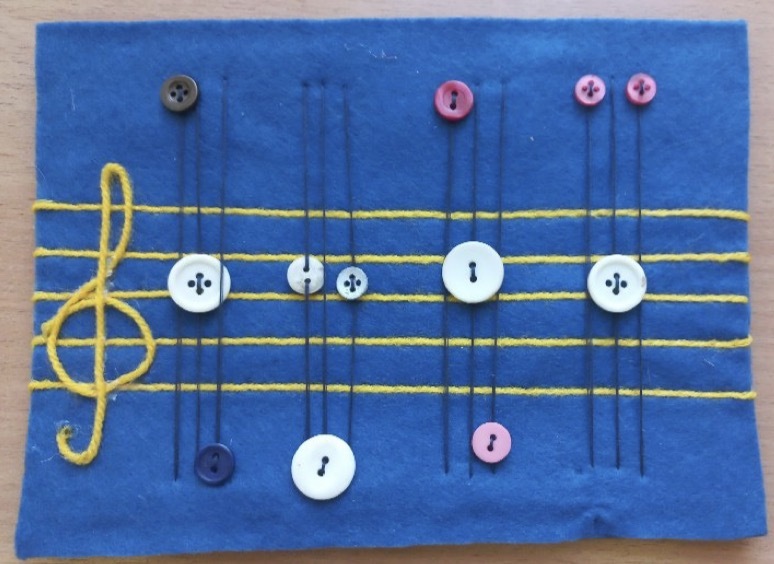 Цель занятия: Закрепление понятий о длительности звуков («долгий звук», «короткий звук»), развитие слухового восприятия и музыкальной памяти, приближение детей к пониманию нотного письма через игру с пуговицами.