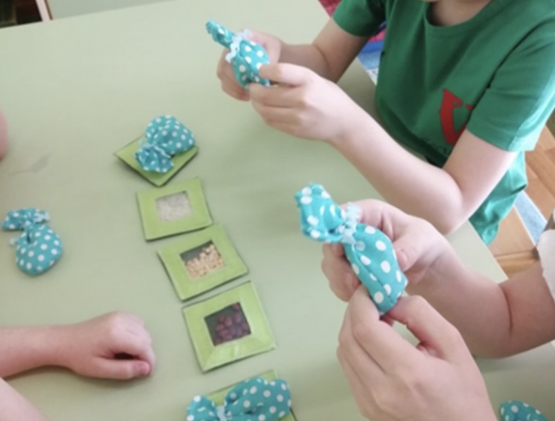 В игре участвуют двое детей. Перед первым ребенком лежат мешочки, перед вторым ребенком квадратные мешочки с открытым окошком. Первый ребенок определяет на ощупь, что лежит в мешочке и описывает содержимое другу, не называя, что лежит.
