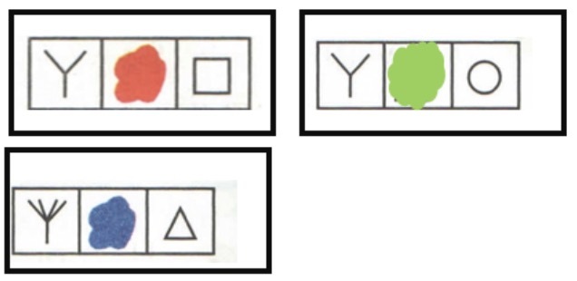 - Ребята на столе лежат карточки со схемами, где каждый знак обозначает свойства фигуры: - размер (маленький) фигуры, - размер (большой) фигуры, - цвет фигуры, - форма фигуры.