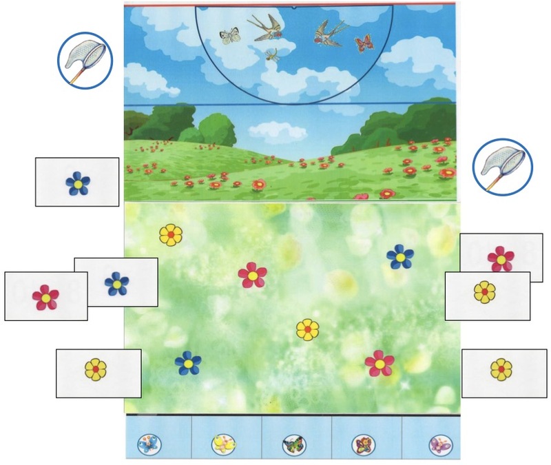 1. Игровое поле с заданиями 2. Круглые фишки убегающего бабочки (6 штук диаметром 2 см) и преследователя – сачок (2 штуки диаметром 4 см)