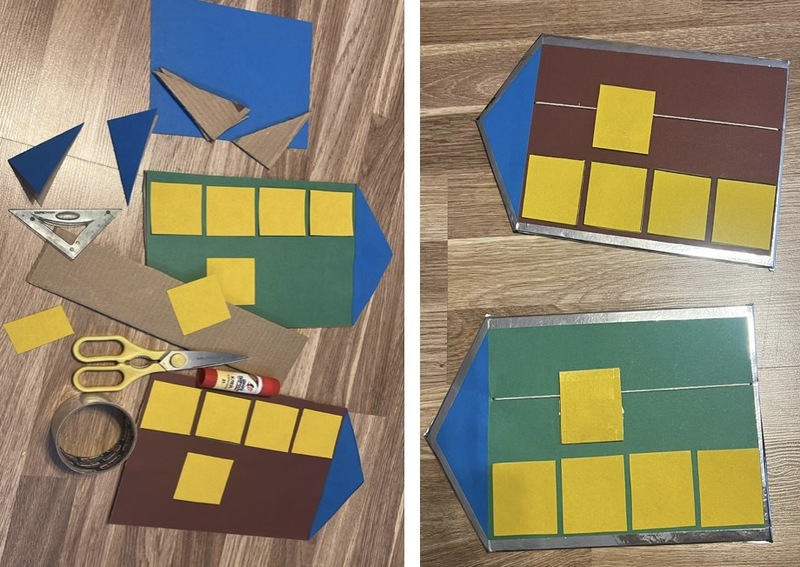 Пособие представляет собой картонную основу,к верхней части которой горизонтально прикреплены две параллельные нитки.