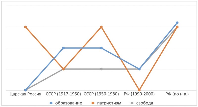 - 2)СССР формируемые основы патриотизма, слабо осознаваемая свобода, растущий уровень образованности (геодезисты, полярники, электрики, нефтяники);
