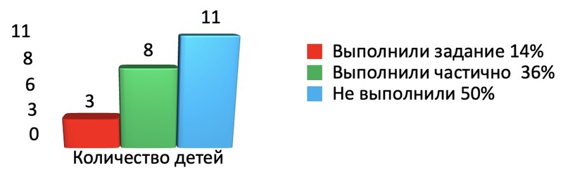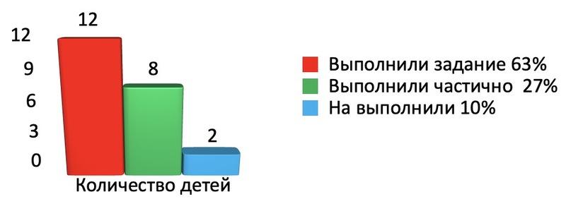 Некоторые дети показали низкий уровень развития мелкой моторики руки. Возникли некоторые трудности в складывании матрешек, пирамидок, в выполнении шнуровки Дети, выполняя задание, допускали ошибки. 15 детей с заданием не справились, несмотря на помощь педагога.